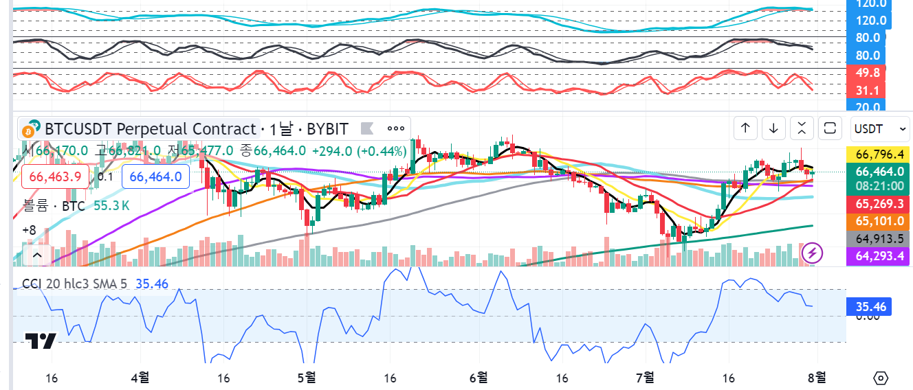 현재 기준(2024.08.01)으로 비트코인 1일봉입니다. 트럼프의 발언으로 비트코인이 상방으로 쏘았다가 다시 하방으로 향하고 있음을 확인할 수 있습니다. 이게 휩쏘로 조정으로 작용할지, 하락의 시작일지는 미지수이나 현재 20일선(빨간색선)이 상방으로 향하고 있음을 볼 때는 다시 조정일 가능성이 크다고 생각합니다.