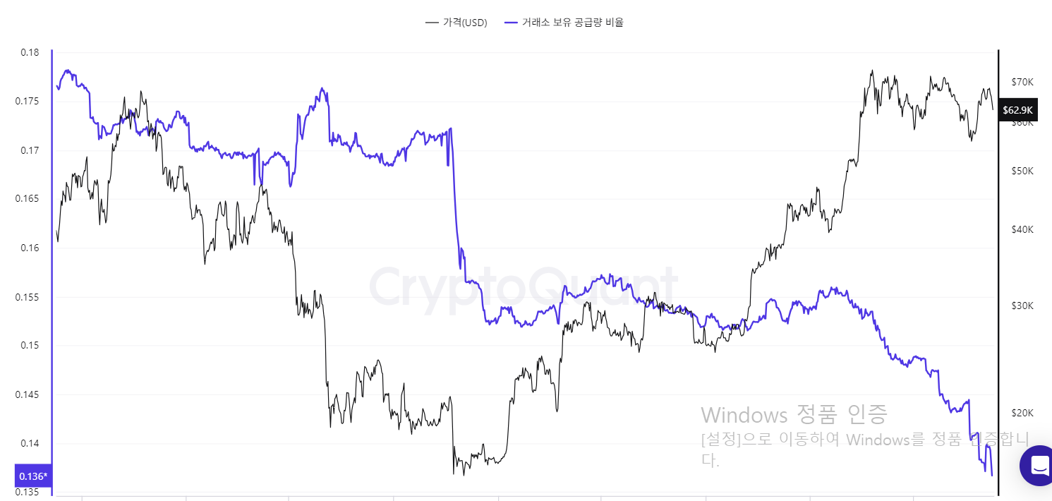 위의 차트를 보면, 거래소 보유 공급량의 비율이 계속 줄어드는 것을 확인할 수 있습니다.